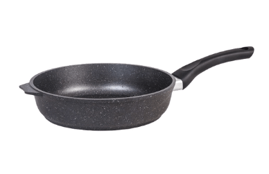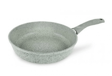 Univerzalna aluminijska tava malog promjera 24 cm, ručka je pričvršćena vijcima, izrađena od bakelita, ne zagrijava se. Prevlaka s granitnim čipovima pouzdana, visokokvalitetna, potpuno eliminira vjerojatnost lijepljenja hrane. Ne možete staviti tavu u pećnicu i kuhati na indukcijskim kuhalima.
