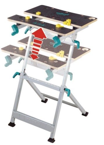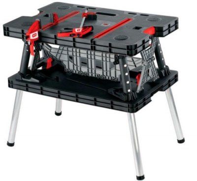 Lak i prikladan pomoćnik za stolara je radni stol Keter Folding Work Table. Izrađena je od polipropilena, koji ne samo da ima malu težinu, već je otporan na UV svjetlo. Model je opremljen teleskopskim nogama, zahvaljujući kojima se visina može podesiti na razini od 75,5-85,5 cm, a dizajn uključuje i donji gornji dio stola. Unatoč maloj težini (13,5 kg), nosivost uređaja je 453 kg. Isporučuje se s dvije stezaljke pomoću kojih možete pričvrstiti obradak koji se obrađuje.