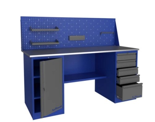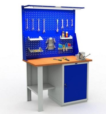 Svaki stvarni vlasnik želi imati svoj kutak za kreativnost. Neki rade u garaži, drugi stvaraju svoja remek-djela u radionici. Najbolji "namještaj" u takvim slučajevima bit će radni stol Workbench PROFFI-E 218. Ovaj proračunski model iz profesionalne serije ima dvostruki dizajn. U jednom od postolja napravljene su police za spremanje alata, u drugoj su ladice. Oba noćna stola zatvorena su metalnim vratima. Stražnji zid ulazi u zaslon, na kojem su postavljene razne police i držači za alate i male alate. Ispod stola je prikladno smještena klupa za klupu koja spaja dva ormara. Na njega možete stavljati limenke s posudama ili spremnicima s mastima ili bojama.