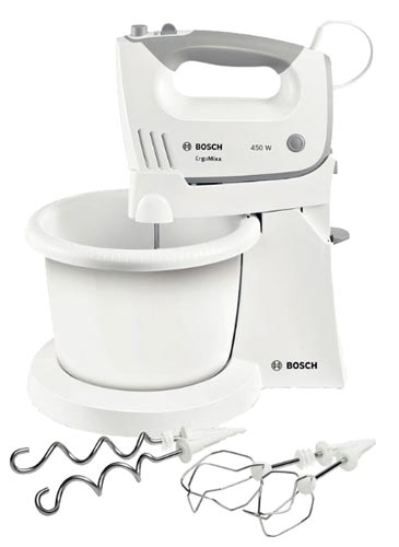 Drugo mjesto u ocjeni stacionarnih miješalica nalazi se - Bosch MFQ 36460, popularan model, zasluge koje se smatraju tihim radom, optimalnom snagom i razumnom cijenom. Zajedno s mlaznicom na mikseru okreće se posuda (pomoću posebnog auto-pogona), tako da se proizvodi pomno miješaju. Skupština - Slovenija, tako da kvaliteta gradnje ne dolazi u obzir. Kapacitet posude od 3 litre "s planinom" dovoljan je za kulinarske zadatke, a 5 brzina omogućuju vam da odaberete optimalnu brzinu za različite vrste jela. U kombinaciji s uređajem, korisnik će pronaći umutak za premlaćivanje i kuku za miješanje tijesta. Nije mnogo mlaznica, ali najpotrebnije. Ugradnja i uklanjanje mlaznica pritiskom na posebnu tipku na dršci mješalice, što je vrlo povoljno.
