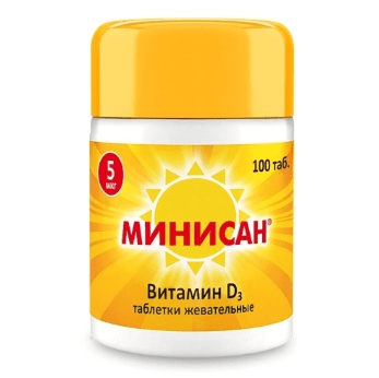 Pripravak "Minisan" sadrži optimalnu dozu vrijednog vitamina. Proizvodi se u obliku tableta za žvakanje, 100 komada u jednom pakiranju. Budući da je preporučena doza za jednu odraslu osobu 1 tableta dnevno, postoji dovoljno konzervi vitamina za tri mjeseca - cijena je veća od proračuna, a koristi su ogromne. Trudnice, dojilje su kontraindicirane ili se mogu uzimati samo na recept. Pod istim imenom, vitamin D je dostupan u kapima - može se davati djeci za pravilno formiranje koštanog kostura.
