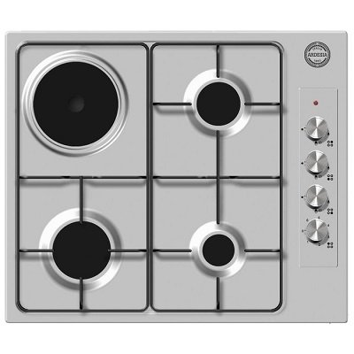 Ovaj dizajn s 4 prstena savršen je za ljetne kuće i ladanjske kuće, jer osim 3 plinska plamenika, ovdje se nalazi i jedan električni. Osim toga, uređaj je dodatno opremljen mlaznicama za plin u bocama, tako da ćete biti neovisni o centraliziranom napajanju izvora energije. Takav kombinirani model se ne razlikuje po veličini od standardnih analoga izvora topline. Ugrađeni parametri su 56x48 cm.