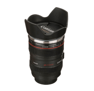 Neobična i jeftina termokraka, koja se može predstaviti kao poklon, izrađena u obliku objektiva fotoaparata. Dizajn je originalan, svatko će mu se svidjeti, a ne samo oni koji uživaju u fotografiji. Šalica izgleda prilično realistično, izrađena od kvalitetnih materijala - čelična tikvica, crna plastična kutija.