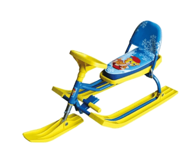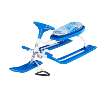 Udoban snježni skuter s tipom upravljača, tri skije i mekana sjedala. To osigurava stabilan položaj i udobnost tijekom vožnje. Unatoč metalnom okviru, model je lagan - 6 kg. Konstrukcijska čvrstoća zbog dopuštenosti visokih opterećenja do 100 kg. To vam omogućuje da istovremeno vozite dvoje djece 4-5 godina. Vozeći se niz brdo, dijete može sam kontrolirati snježni skuter - promijenite smjer kretanja, po potrebi kočite. Udobnost dodaje dobar sustav amortizacije.