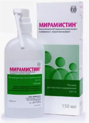 Unatoč nekompliciranoj kompoziciji, Miramistin pokazuje najbolja svojstva, ne dopuštajući klicama da se umnožavaju i donose štetu tijelu. Glavna komponenta je benzildimetil miristoilaminopropil amonijev klorid, a pomoćna tvar je voda. U kombinaciji, mogu poboljšati regeneraciju laringealnog tkiva i spriječiti različite komplikacije bolesti. Nedostaci spreja uključuju vrijeme primjene - do 10 dana, inače možete dobiti neugodnu nuspojavu u obliku dysbioze usne šupljine.