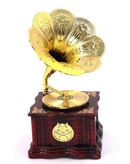 Glazbena kutija stilizirana kao gramofon privlači pažnju ljubitelja glazbe s iskustvom. To je izvrstan izbor za one koji su dobro upoznati u povijesti zvuka, cijeni vintage drangulije napravljene s ukusom i šarmom. Metalni dijelovi tijela imaju elemente utiskivanja, umetke, ističu se profinjenost linija i konfiguracija konstrukcije.
