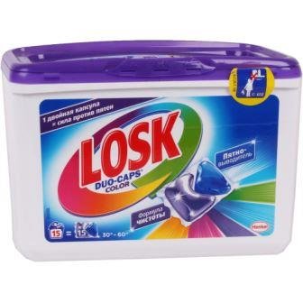 Losk Duo-Caps Color je inovativni alat za pranje obojenih odjeća. Kapsule se sastoje od 2 komponente: učinkovitog sredstva za uklanjanje mrlja i koncentriranog gela koji osigurava savršenu čistoću stvari. Alat lako rukuje čak i najupornijim zagađivačima iz tinte, markera, kave, kozmetike itd.