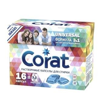 Kapsule za pranje Corat Color ne mogu uzrokovati alergijsku reakciju jer ne sadrže fosfate, spojeve klora i etil alkohol. Jedna stvar je dizajnirana za 4-5 kg posteljine, bez obzira na tvrdoću vode. Koratne kapsule dostupne su u kartonskim pakiranjima od 16 komada, pa ih je preporučljivo držati na mjestu koje je dobro zaštićeno od vlage. Glavne prednosti: bez sintetskog mirisa, omekšavanja, atraktivne cijene. Kontra: nije prikladno za pranje osjetljivih tkanina.