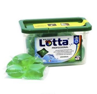 Kako se nositi s bilo kakvom kontaminacijom na temperaturi od samo 30 ° C pomoći će Lotta Universal kapsulama koje sadrže koncentrirani gel za boju. Najbolji izbor za pranje obojenih predmeta. Oni sadrže enzimski kompleks, aktivni kisik i sredstvo koje sprječava stvaranje razmjera. Glavna prednost kapsula su dodatni aditivi koji poboljšavaju glačanje odjeće nakon pranja. Alat je dostupan u nekoliko serija: "Izbjeljivanje", "Održavanje boje", itd.