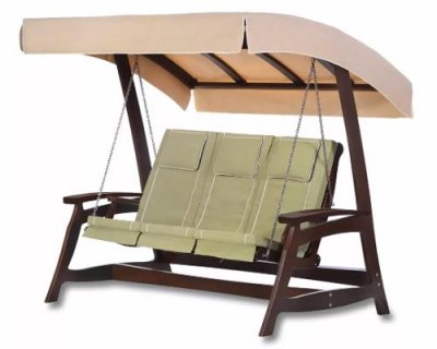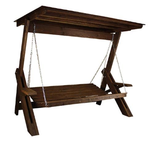 Ljuljačka je u potpunosti izrađena od borovih i borovih iglica. Oni su sklopivi i imaju kapacitet do 3 osobe. Sjedalo je ovješeno na čeličnim lancima pouzdanim pričvrsnim elementima, tako da je konstrukcija vrlo sigurna. Njegova širina je 210 centimetara, a visina mu je 188. Nadstrešnica vrta atributa je prilično tvrda, sastoji se od polikarbonata od 4 milimetra, tako da ga kiša neće oštetiti. Opterećenje ljuljačke izdržati vrlo velike - 240 kilograma. Oni su obojeni u ekološki prihvatljivom ulju.