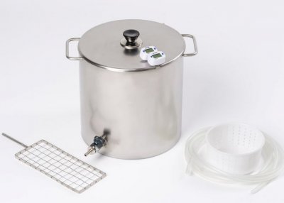 Najbolja opcija za dom jer ovaj pasterizator daje umjereni prinos sira - do 1,3 kg po radnom ciklusu. Ciklus traje od dva do pet sati. Mini tvornica sira radi u načinu pasterizacije i naknadne pripreme domaćeg sira, svježeg sira, kiselog vrhnja, jogurta ili kefira. Pored glavne jedinice s poluautomatskom kontrolnom jedinicom, komplet sadrži sve što je potrebno za organiziranje procesa: digitalni termometar s spojnicom, spojnice i crijeva za spajanje na cjevovod, sirilo, kalcijev klorid i oblik za sir. Također je uključena knjiga recepata, putovnica s uputama i jamstvenim listom. Ostaje da se napravi jednostavna montaža i kupi svježe mlijeko.