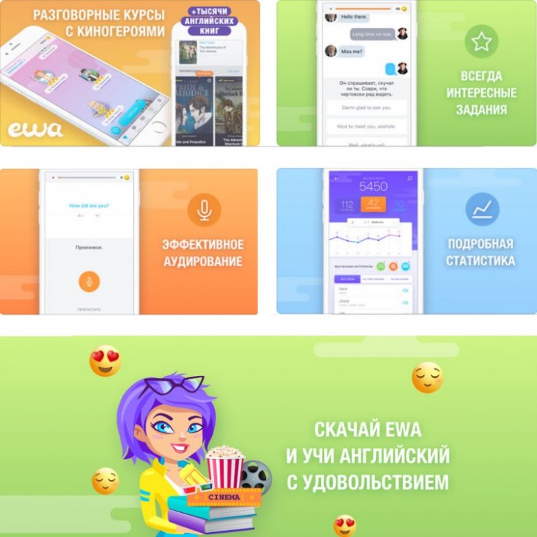 Aplikacija EWA omogućuje učenje engleskog jezika na iPhoneu u najzanimljivijem i najboljem, prema mišljenju mnogih profesionalaca. Korisnik je pozvan na više od 1000 izvornih engleskih knjiga, od kojih se svaka odnosi na određenu razinu - od početnika do naprednih. Glavna prednost ovog pristupa bila je sposobnost da se pronađe prijevod nepoznate riječi u knjizi i da se pošalje na studij jednim klikom.