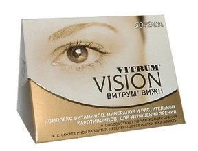 Vitrum Vision se sastoji od tvari s antioksidativnim djelovanjem koje smanjuju stres, umor i suhoću. Redovita primjena lijeka smanjuje rizik od razvoja katarakte i sličnih patologija. Proizvođač je dodao vitamine E i C, karotenoide i elemente u tragovima. Ako vjerujete u tvrtku, brzo se probavljaju, rezultat je vidljiv za tjedan dana. Kupci primjećuju da su oči manje umorne, učinak je kumulativan. Vitamini su dopušteni svim dobnim skupinama, ispuštaju se zbog bolesti vlakana. Pregledi upozoravaju da postoji i Vitrum Vision Forte, koji se razlikuje samo u doziranju. Potonji je pogodan za starije generacije.