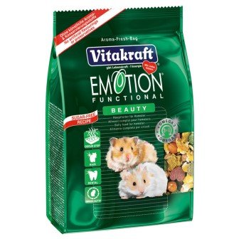 Emotion Beauty je kvalitetna, zdrava hrana koja dolazi u obliku višebojnih granula. To savršeno rješava pitanje selektivnog jedenja, kada životinje iz smjese izaberu samo suho voće. Kao rezultat toga, ljubimac dobiva sve korisne makro-i mikronutrijente iz hrane. Među prednostima: idealan za hrčak različitih vrsta, jača imunološki sustav i ima prikladan oblik oslobađanja. Jedini negativ je visoka cijena. U prosjeku pakiranje ove hrane iz Vitakrafta traje 4-5 mjeseci.