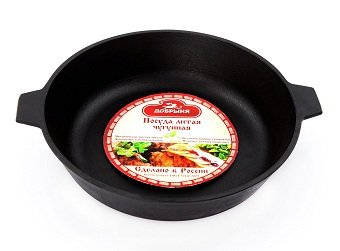 Ruski lijevano željezo proizvodi se u tvornicama s bogatom poviješću, stoga je visoke kvalitete i izdržljiv. Ova posuda se odnosi na vrstu univerzalnog lijeva, za koje je u aktivnoj potražnji. Nedostatak šavova, spojeva sprečava stvaranje hrđe, prijevremeno habanje ili prekidanje ručke. Proizvod je okruglog oblika promjera 26 cm, dovoljno dubok (6 cm) za učinkovito prženje, kuhanje mesa, ribe i povrća. U njemu sastojci ne gube svoj miris, ne dobivaju metalni okus, zagrijavaju se ravnomjerno.