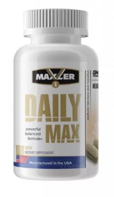 Više pristupačne vitamine za cijenu po porciji osigurava Daily Max dodatak. Sadrži osnovni set od 23 sastojka. Svaka od komponenti ne prelazi 100% za potrošnju iz dnevne potrebe. Neki elementi (magnezij, cink, jod, selen) sadržani su u manje od 30% potrebne razine. Zaradite predoziranje vitaminima je vrlo teško. Pogodan za vježbanje u laganoj i srednjoj formi u teretani. Ili oni koji iskuse druge manje fizičke napore na tijelu.