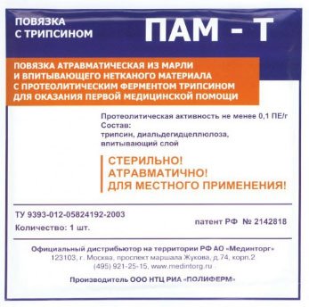 PAM-T je jeftin i učinkovit alat. Izvrstan je za liječenje rana s puno izlučivanja. Upijajući sloj zadržava tekućinu. Zavoj bezbolno čisti ranu, sprječava ulazak bakterija. Jedan tečaj traje od 3 do 7 dana. Flaster se sastoji od dva sloja. Medicinski kontakt s kožom, a upijanje omogućuje manju promjenu zavoja. Formula se temelji na enzimu koji ima protuupalna svojstva. Čisti kožu od nekroze, gnojidbe, ali ne oštećuje živo tkivo. Posjeduje dobru drenažu, anestezira. Formula ne uzrokuje alergijske reakcije. Samo kao primarni tretman, preljev neće raditi, potrebna vam je mast / gel.