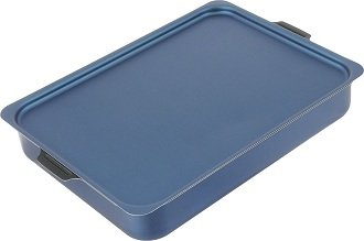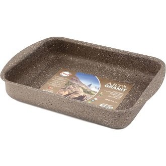 Uređaj dimenzija 27x35 cm pripada novoj seriji kuhinjskog posuđa, čija je glavna značajka 7-slojna struktura na osnovi keramičkog granita. Vanjski keramički sloj daje elegantan izgled dodatku, štiti ga od pregrijavanja, ne ulazi u kemijske reakcije s vodom, masnoćom, prehrambenim kiselinama. Dobiveni u postupku žigosanja pekača dobiveni lijevani ručke preko cijele širine pravokutnog spremnika, koji imaju protuklizna svojstva. Visina zidova od 6,7 cm smatra se najoptimalnijim, omogućuje vam pripremu jela za svačiji ukus.