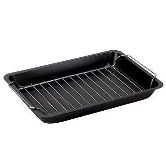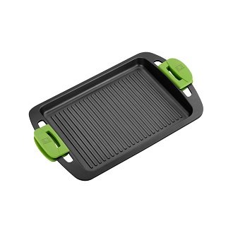 Visina stranica pravokutnog dizajna od 5 cm dovoljna je za postizanje željene mikroklime unutar spremnika. Specijalni roštilj s ručkama uključen u set i pojednostavljuje proces pečenja. Dno pribora ima Goldflon non-stick sloj, tako da proces prženja prati manje izražen karakterističan miris.