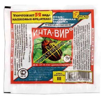 Temelj lijeka Inta-vir je cipermetrin, koji uzrokuje trenutačnu smrt aphids. Lijek je indiciran za sve insekte, glodanje lišća. Jedan tečaj sastoji se od 3 tretmana. Alat nije pogodan za prevenciju, samo kod teških infekcija. Zbog agresivne formule šteti ne samo lisnoj uši, već i korisnom kukcu. Lijek je toksičan za ribe, pa je zabranjeno koristiti ga u blizini vode. Tijekom rada nosite rukavice, čizme, respirator i naočale. Formula se može koristiti kod kuće, ako temeljito provjetravate prostoriju.