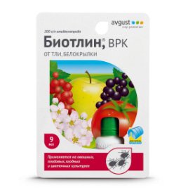 Biotlin nadmašuje konkurenciju u trajanju. Temelji se na tvari imadakloprid, koja ima akaricidna i insekticidna svojstva. Ona ulazi u tijelo štetočina, paralizira dišne puteve i probavni trakt.Afida umire za nekoliko sati. Lijek je najbolji za integrirani učinak na odrasle, larve i jaja. Paraziti koji su se preselili s drugih stabala, umiru za nekoliko dana. Tada ih vjetar lomi, lišće kiše.