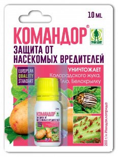 Zapovjednik ima za cilj da se riješi vrtnih štetnika. Osnova je jak organski otrov imidakloprid. Dodaje se 200 grama po litri. Lijek dolazi u ampulama s različitim volumenima, postoje opcije za domaće biljke i veliki povrtnjak. Ne gubi na učinkovitosti čak ni na vrlo visokim temperaturama. Brzo se otopi u vodi, pretvarajući se u stabilnu suspenziju. Aphids se ne navikavaju na formulu, ona vrijedi nekoliko sezona. Niska toksičnost ne šteti prirodi.