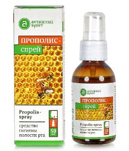 Propolis sprej, kao što mu i ime kaže, sastoji se od pčelarskog proizvoda razrijeđenog etilnim alkoholom i glicerinom. Ova tekućina jantarne boje s ugodnim mirisom najbolje je za prirodnu regeneraciju epidermisa. Propolis se smatra jedinstvenom tvari koja uključuje ulja, masne kiseline, flavone, aminokiseline, vitamine. Ima snažan dezinfekcijski učinak, poboljšava regeneraciju epitela. Pomaže drugim drogama u borbi protiv gljivica ako uzrokuju stomatitis. Jedina kontraindikacija je netolerancija na med, pelud, bilo koji otpadni proizvod pčela.