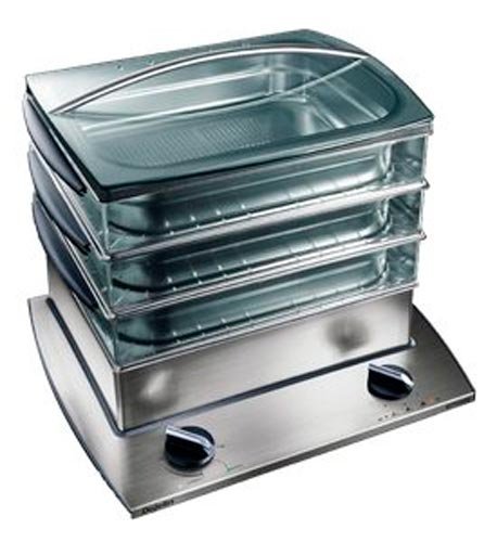 Ovaj model na prvi pogled osvaja kupce elegantnim, neobičnim dizajnom u retro stilu. Steamer mehanički, ali prilično funkcionalan. Osim kuhanja, ona zna kako odmrznuti hranu nježno, a da pritom ne izgubi hranjivu vrijednost. Odmrzavanje se može podesiti po vremenu ili težini. Ako kod kuće ima male djece, možete postaviti kontrolnu bravu. Sigurnost uporabe je poboljšana automatskim isključivanjem pare kada su vrata dvostrukog kotla otvorena. Ako je potrebno, možete podesiti odgodu početka isporuke gotovog jela do određenog vremena. Na primjer, dolazak s posla.