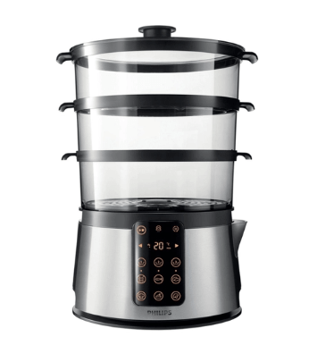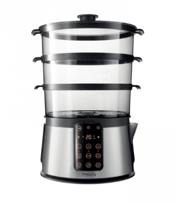 Jedan od najfunkcionalnijih, ali u isto vrijeme i prilično pristupačnih parobroda poznate tvrtke. Ima sve što je potrebno za ugodno kuhanje ukusne i zdrave hrane. To su tri prostrana sloja dobre plastike, kapacitet litre za rižu, posebna posuda za juhu, odjeljak za dodavanje začina. Na svakoj razini postoje odjeljci za kuhanje jaja, voda se može nadopuniti bez skidanja košara. Kontrola modela je elektronička, s mogućnošću ugradnje programa koje nudi proizvođač.