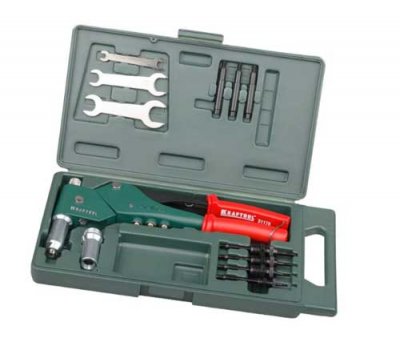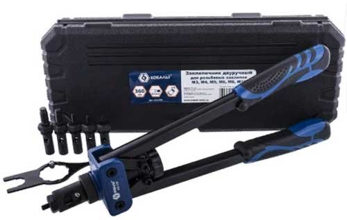 Mlaznice različitih veličina omogućuju vam rad s klinovima potrebnog promjera, ovisno o debljini spojenih materijala. Navojni konektori mogu biti u rasponu od M3 do M10. Komplet također ima sve potrebne tipke, a za nošenje i skladištenje - zgodan kovčeg. Riveter podjednako dobro funkcionira s spojnim okovom od aluminija, čelika i bakra. U pregledima, glavna prednost je praktičnost gumiranih ručki i minimalni iznos fizičkog napora koji se treba primijeniti za ugradnju navojnog spoja. Zbog toga se igla često otkida - strojar jednostavno ne osjeća da je zakovica potpuno zategnuta.