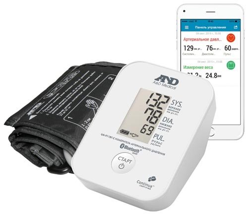 Automatski monitor krvnog tlaka s LCD zaslonom duplicira očitanja putem Bluetootha na pametni telefon s Android ili iOS platformom. Da biste to učinili, morate preuzeti aplikaciju A & D Connect za mobilne uređaje. Također je moguće pohraniti podatke na svoj račun na službenim stranicama. Lagani uređaj (300 g) ima bezbolnu manžetu koja koristi unutarnju cilindričnu gumenu komoru. To pridonosi ravnomjernoj raspodjeli pritiska na ruku i ublažava bol tijekom inflacije manžete.