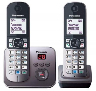 Baza + dvije slušalice u ocjeni seta radio telefona je model poznatog japanskog proizvođača Panasonic KX-TG6822. Pri najnižoj cijeni u TOP-3, ovaj set ima sve potrebne funkcije za normalan rad.Veza između komponenti provodi se putem radio signala GAP i DECT standarda, što omogućuje povezivanje dodatnih cijevi na mrežu (fiksna baza služi do 6 komunikacijskih uređaja).