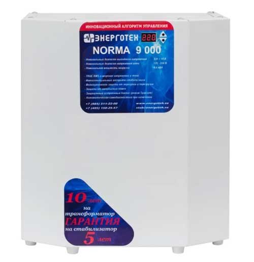Elektronski stabilizator Energotech NORMA 9000 odspojen je od mreže kada napon padne na kritičnu razinu od 60V. Do te granice, njegov transformator može osigurati rad uređaja i generirati izlazni napon od 220V. U ovom slučaju, pogreška ne prelazi 7%. To je postignuto kroz 9 stabilizacijskih koraka. Oprema će osigurati gotovo sve kućanske aparate s električnom energijom - 9 kW snage će biti dovoljno za perilicu i pećnicu, a da ne spominjemo hladnjak, TV ili plinski kotao. Instalacija na zemlji vikend će lišiti vlasnika mnogih problema, pogotovo ako je električna mreža na koju je kuća spojena, je u dotrajalom stanju.
