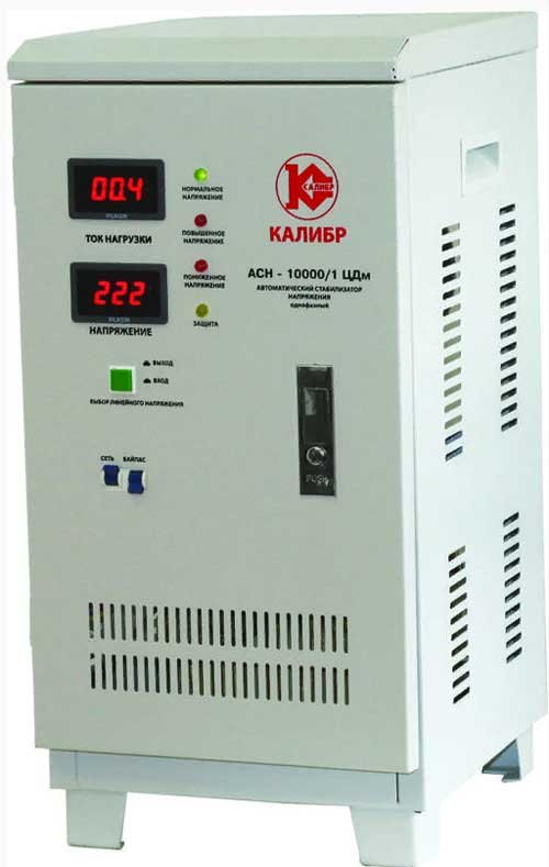 Jedan od proračunskih elektromehaničkih stabilizatora prikazan je u obliku podne konstrukcije. Ima sve potrebne stupnjeve zaštite mreže od kritičnih opterećenja, ovaj uređaj je sposoban držati 220V na izlazu s ulaznim naponom od samo 140V.Na prednjoj ploči nalazi se digitalni prikaz radnih parametara i prekidača za upravljanje obilaznicom i spajanje na zajedničku mrežu, kao i sa paketnim osiguračem.