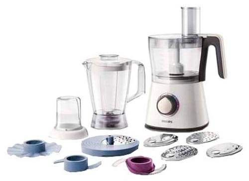 Po pravilu, mjesto na ljestvici zauzima procesor hrane s miješalicom tvrtke Philips. Pristupačna cijena je ključna prednost modela, ali daleko od toga. Na primjer, komplet sadrži 10 mlaznica - svestrani nož, umutač za pripremu emulzija, rezanje slamki, ribež i dr. Dodatni plus je brusilica, koja se koristi za mljevenje oraha i začina.
