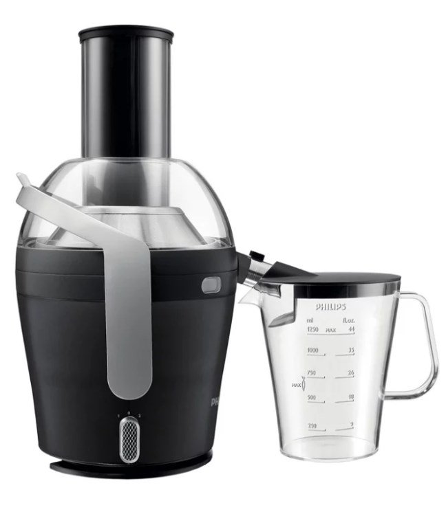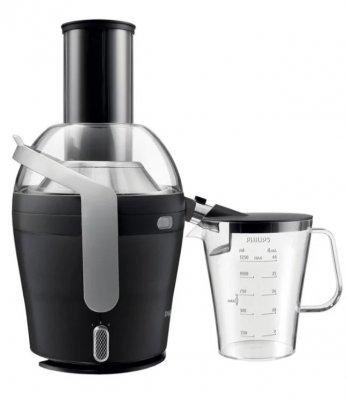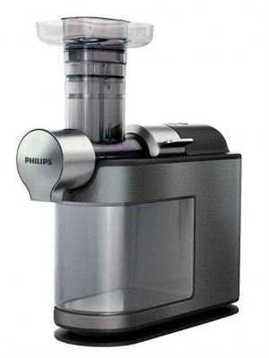 Sokovnik tvrtke Philips pokazuje uspješnu kombinaciju cijene i kvalitete. Za pristupačnu cijenu možete kupiti centrifugalni uređaj za centrifugiranje s mnogim korisnim značajkama. Auto sakupljanje otpada odvija se u posebnom spremniku od 1 litre. Sok teče izravno u čašu od 500 ml. Sustav protiv kapanja sprječava curenje pića kada je okretanje završeno. Slučajni start postaje nemoguć zbog zaštitne opcije.