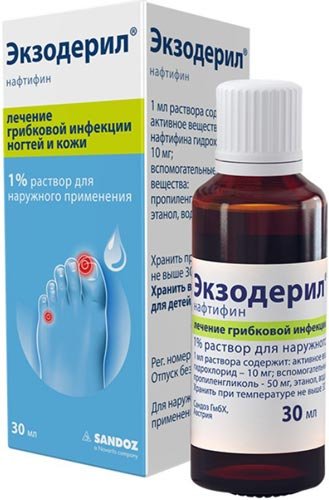 Lijek "Exoderil" proizvodi se u obliku otopine koja se jednom ili dva puta dnevno nanosi na zahvaćeno područje. Staklena cijev ima volumen od 20 ml. Djelovanje se temelji na potiskivanju aktivnosti određenog enzima koji usporava sintezu tvari koja je dio stanične stijenke gljivice. Za učinkovitu borbu protiv gljivica, lijek se koristi najmanje šest mjeseci.