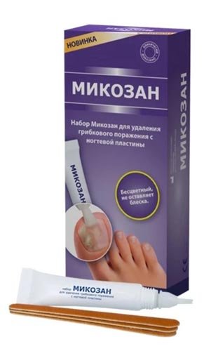 "Mikozan" - jedinstveni alat za liječenje gljiva noktiju, koji uključuje mast za vanjsku uporabu i 10 specijalnih datoteka za nokte različitih veličina. Prodirući iznutra, lijek stvara zaštitnu barijeru protiv različitih gljivica, poboljšava gustoću ploče nokta i učinkovito se bori protiv lezija. Dopušteno je za djecu stariju od 4 godine. Mast je predstavljena u obliku cijevi od 5 ml i opremljena je udobnom četkom.