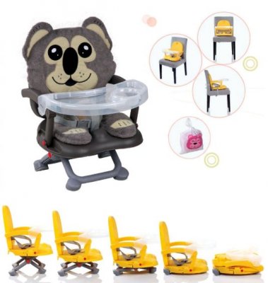 Kupnjom stolice za podizanje štedite prostor i novac bez gubitka prilike za udobno hranjenje bebe. Uređaj za povišenje tlaka obično se postavlja na stolicu "za odrasle", pričvršćujući je trakama tako da ne posustane. Ako ne želite odmah sjesti dijete na visoku stolicu, onda se pojačalo može staviti na pod, pa će se mrvica postupno navikavati na hranjenje za stolom. Booster stolice zauzimaju prva mjesta u ocjenama roditelja koji stalno putuju s djetetom, jer je takva stolica vrlo lagana i kompaktna kada je presavijena i idealna za transport u rukama, za razliku od, primjerice, transformatora.