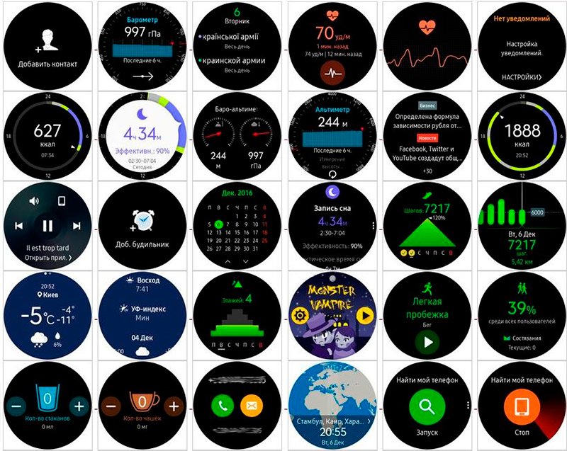 Već je dosta instaliranih aplikacija u satu koji se ne nalazi u kutiji. Konkretno, gadget je lako vidjeti datum, vrijeme, vrijeme, staviti podsjetnik ili alarm, čitati i odgovarati na poruku ili glasnik, prebacivati se između vremenskih zona i tako dalje. Ali možete instalirati nove iz trgovine Galaxy Apps. U trgovini možete pronaći sve vrste aplikacija za pametne satove, čak i nazvati taksi. U sportu, satovi su u stanju stalno pratiti različite vrste aktivnosti i potom proizvesti statistiku o tome.
