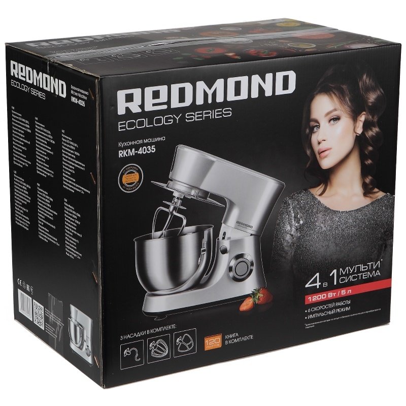 Kuhinjski stroj Redmond RKM-4035 prodaje se u kartonskoj kutiji u standardnom obliku paralelepipeda sa šarenim slikama samog aparata, njegovih mlaznica i posuđa koji se mogu pripremiti uz njihovu pomoć. Također, na paketu je lako pronaći osnovne informacije o tehničkim mogućnostima i dodatnim svojstvima modela.
