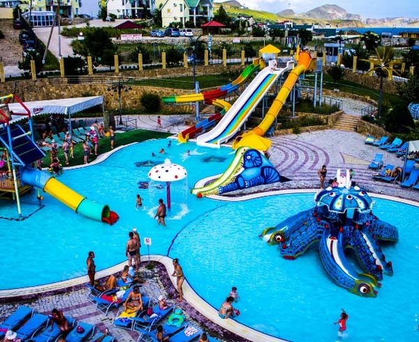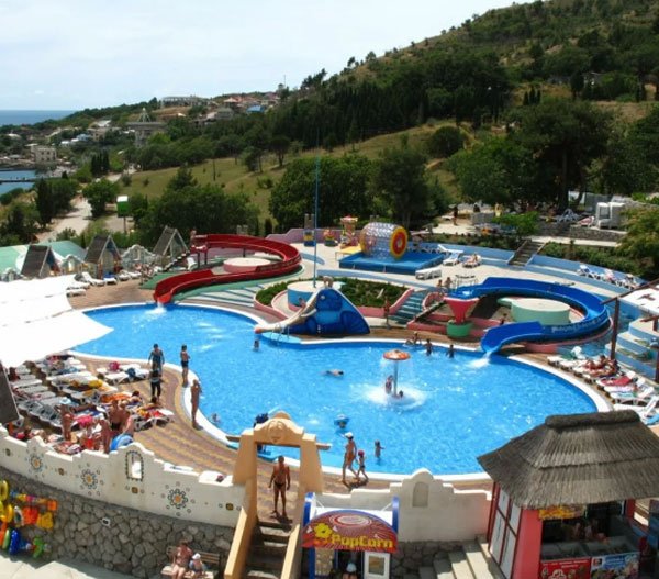 Najnoviji i najveći aquapark na Krimu je Koktebel, koji se nalazi u istoimenom selu. Zauzima površinu od 4,5 hektara. I većina bazena nalazi se. Još jedna prednost vodeni park - veliki broj slajdova. Ima ih 24, od kojih je 12 namijenjeno djeci različitog uzrasta, a 2 su ekskluzivna. Dječje atrakcije izrađene su u nevjerojatnom stilu. Djeca su uvijek oduševljena takvom ljepotom. Ovdje možete provesti cijeli dan uz veliku udobnost. Osim zabave, tu su i restoran, grill bar, pizzeria i sigurno parkiralište.