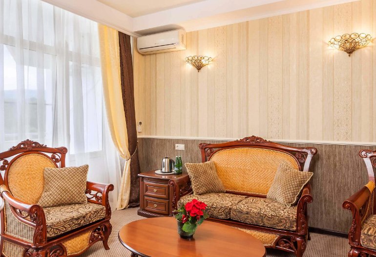 Otvara tri najvrjednija mjesta ostatka Kislovodsk Sanatorium njima. GK Ordzhonikidze, koji se nalazi između dva slikovita parka na nadmorskoj visini od 950 metara nadmorske visine. Na području se nalaze fontane, cvjetnjaci, sportski tereni i dječji tobogani. Naselje ima vlastitu pumpnu sobu s 3 vrste mineralnih voda. Za zabavu oko bazena nalaze se barovi s koktelima s kisikom. Restoran poslužuje jelovnik za različite dijete, doručak, ručak i večeru u određeno vrijeme.