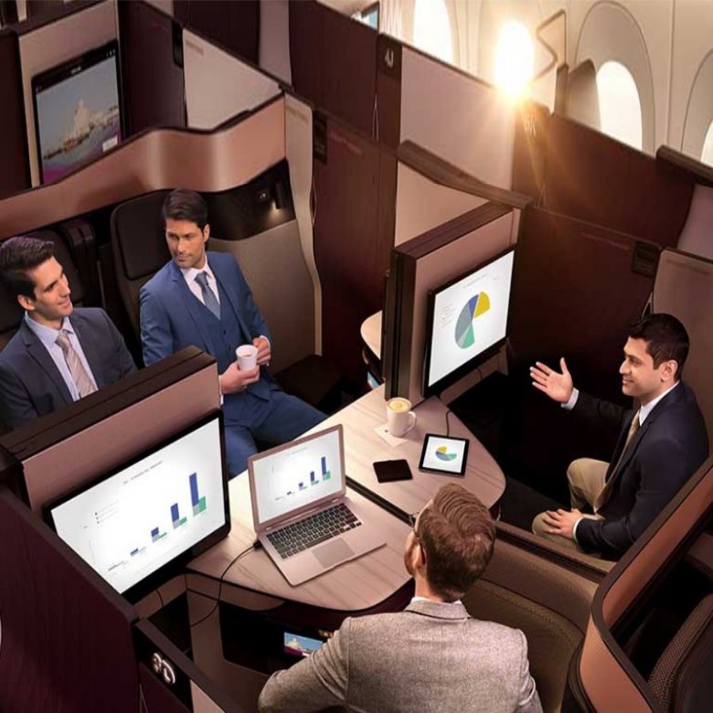 Katarska tvrtka iz godine u godinu postaje sve bolja i danas je u stanju ozbiljno se natjecati s najpoznatijim i najvećim zračnim prijevoznicima našeg vremena. Zona poslovne klase Qsuite postala je najmoćnija i najznačajnija značajka za Qatar Airways, zahvaljujući kojoj je tvrtka mogla zauzeti istaknuto mjesto u mnogim svjetskim topovima, uključujući i Forbesovu ocjenu. Za razliku od drugih zrakoplovnih kompanija, ovaj heroj našeg pregleda nudi putnicima u poslovnoj klasi ne samo obična sjedala u nizu, već i četverokutnu zonu. Prostor je organiziran tako da su sjedala smještena jedan nasuprot drugoga i odvojena su udobnim dvostrukim stolom. Sve to pretvorilo je poslovne prostore u poslovne prostore u izvrsne sobe za sastanke za poslovne ljude ili ugodan kutak za četveročlanu tvrtku.