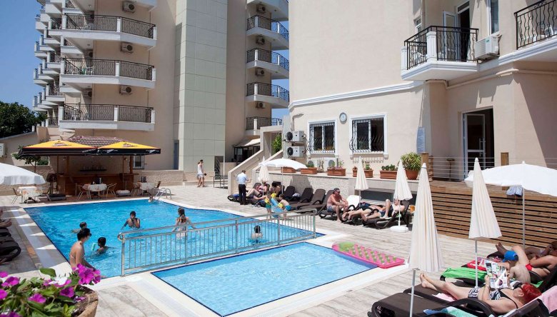 Ugodan hotel Monte Carlo Hotel 4 * idealan je za samostalni i obiteljski odmor. Mali kompleks sastoji se od samo 104 sobe s plazma TV-panelom, sefom i mini-barom. Iz prozora svake sobe pruža se pogled na Sredozemno more ili prostrani bazen koji se nalazi na licu mjesta. Za djecu, tu je tobogan i igralište. Slobodno vrijeme turisti mogu provesti u internet caffe. Dodatna zabava: stolni tenis, odbojka na pijesku, sportovi na vodi.