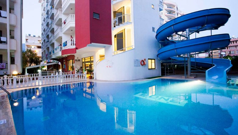Za one koji vole miran i opuštajući odmor, preporučujemo vam boravak u Blue Star Hotelu 4 *. Nalazi se samo 700 metara od mediteranske obale. Ima otvoreni bazen, terasu s ležaljkama i prostrane sobe. Hotel ima 4 bara s bogatim izborom vina, koktela i raznih zalogaja. U restoranu na otvorenom možete kušati ukusna jela turske kuhinje. Besplatni autobusi do središta Alanje, gdje možete ići u kupovinu, redovito odlaze iz kompleksa.