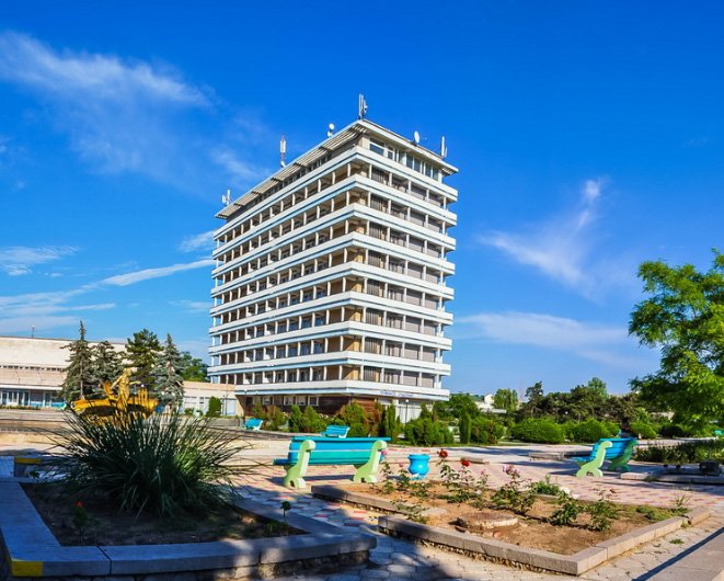 Otvara rangiranje najboljeg pansiona s tretmanom Planeta. Na njenom području nalaze se 2 izvora mineralne vode. Gosti žive u zgradi koja gleda na zimsku fontanu, terarij, umjetni ribnjak, mali zoološki vrt i staklenik. Tijekom cijele godine bazen, sauna i trgovina. Do mora nije tako blizu kao natjecatelji - 800 metara. No, mirovina ima svoju plažu, jedan od najboljih u Evpatoria. Opremljen je modernim sadržajima, tu je i najam motocikala, brodova, jahti. Udoban besplatni prijevoz autobusom vodi do mora. Turisti jedu u restoranu, izbornik se može mijenjati odlaskom u kafiće i kafiće. Od Planeta, autobusi za razgledavanje grada polaze za sva popularna mjesta na Krimu.