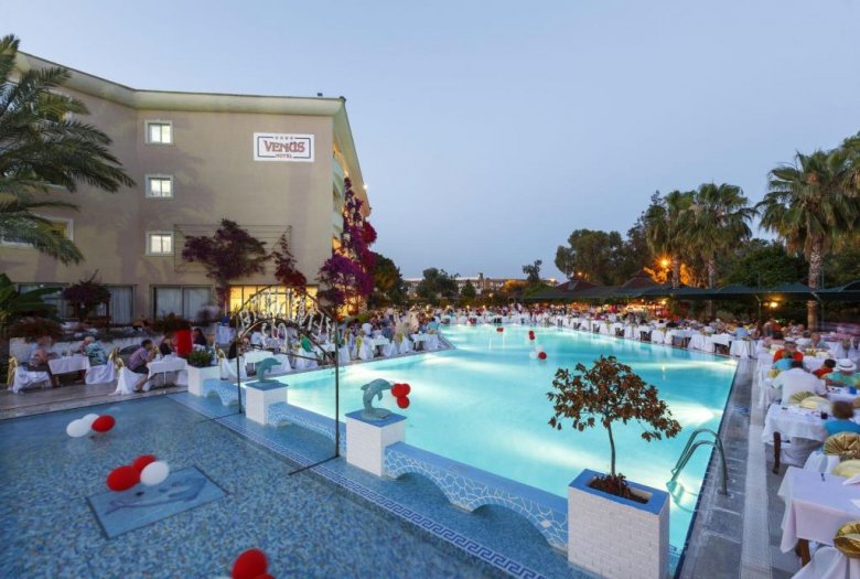 Venus Hotel 4 * jedan je od najboljih Side hotela koji nude bogat odmor na plaži. Nalazi se 350 m od pješčane obale Sredozemnog mora. Za turiste otvorena dva bazena: unutarnji i vanjski. Tu je i SPA salon koji nudi širok raspon programa za njegu lica i tijela. Ujutro gosti mogu uživati u buffet doručku s turskim i međunarodnim jelima. Od 10:00 sati ujutro se otvara bar gdje možete naručiti alkoholna i bezalkoholna pića.